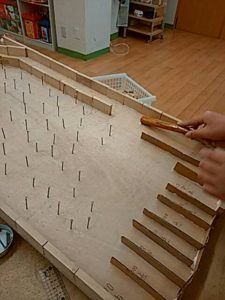 何か作れるかなと大きな板がありましたので釘を打っていったらビー玉を弾いて点数を入れていくコリントゲームを作りました。🔨